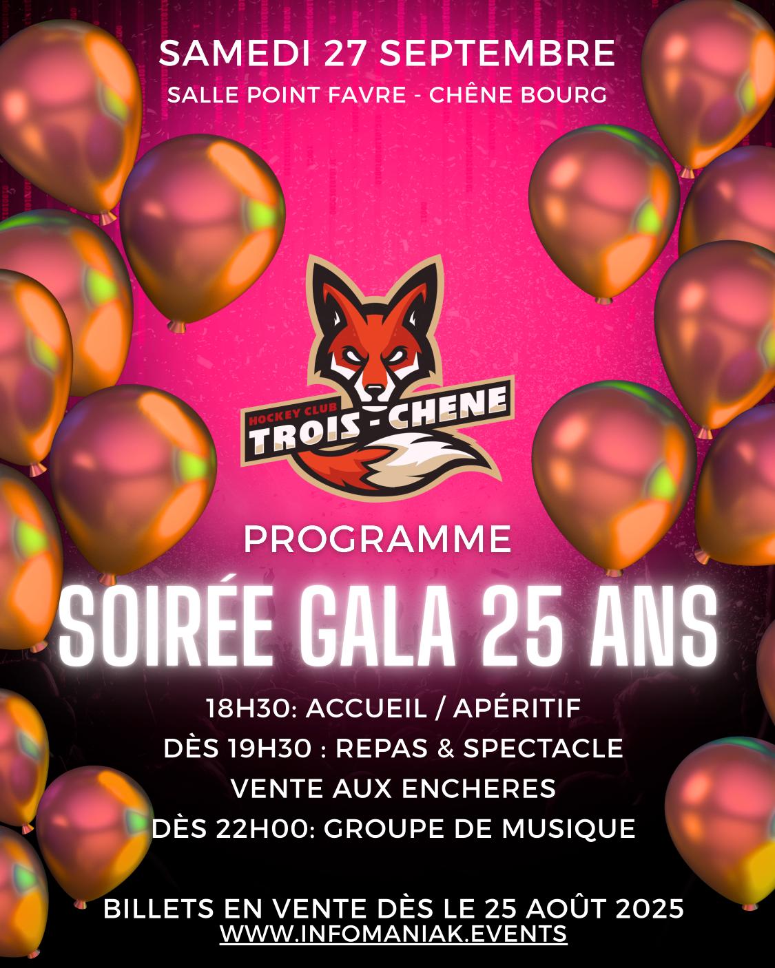 Le samedi 27 septembre, notre club est ravi de vous convier à son gala afin de fêter les 25 ans du hockey sur glace à Sous-Moulin.